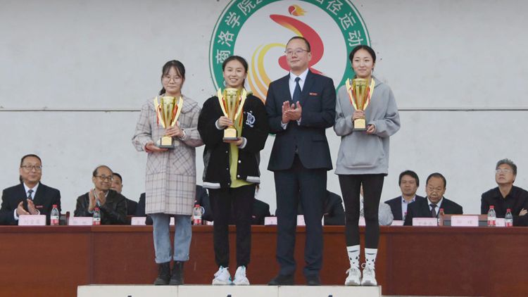 在热烈的掌声中,党委书记龙治刚为获得体育道德风尚奖的团体颁奖,校长范新会为男女团体总分前三名颁奖,副校长郭瑾为男子及女子团体总分前三名颁奖。