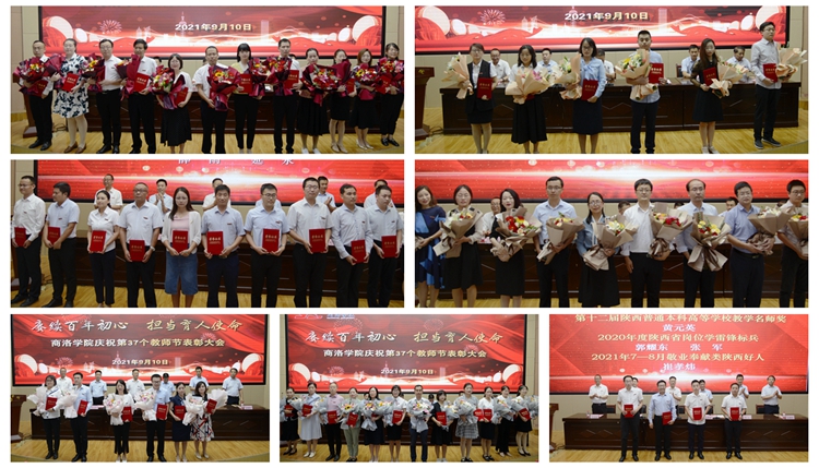 大会对金沙官网2021年先进集体、2020年度目标责任考核先进单位,荣获陕西省教学名师、2020年度陕西省岗位学雷锋标兵、2021年7—8月敬业奉献类陕西好人的教师,及金沙官网2021年优秀教师、2021年优秀教育工作者、“我最喜爱的老师”、学生工作、科技工作及教学工作荣誉获得者进行了表彰。伴随着轻松欢快的背景音乐和电子屏幕不断滚动着的表彰名单,受表彰的集体和个人代表迈着矫健的步伐先后走上主席台,从校领导手中接过奖牌和荣誉证书。校领导与受表彰的教师们亲切握手、合影留念。学生代表上台为受表彰的教师们送上鲜花和诚挚的祝福,感谢老师们的教育之恩和培育之情。